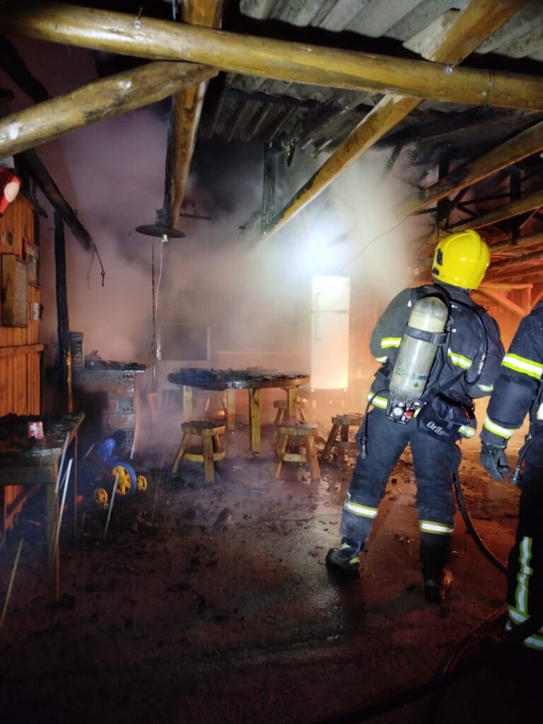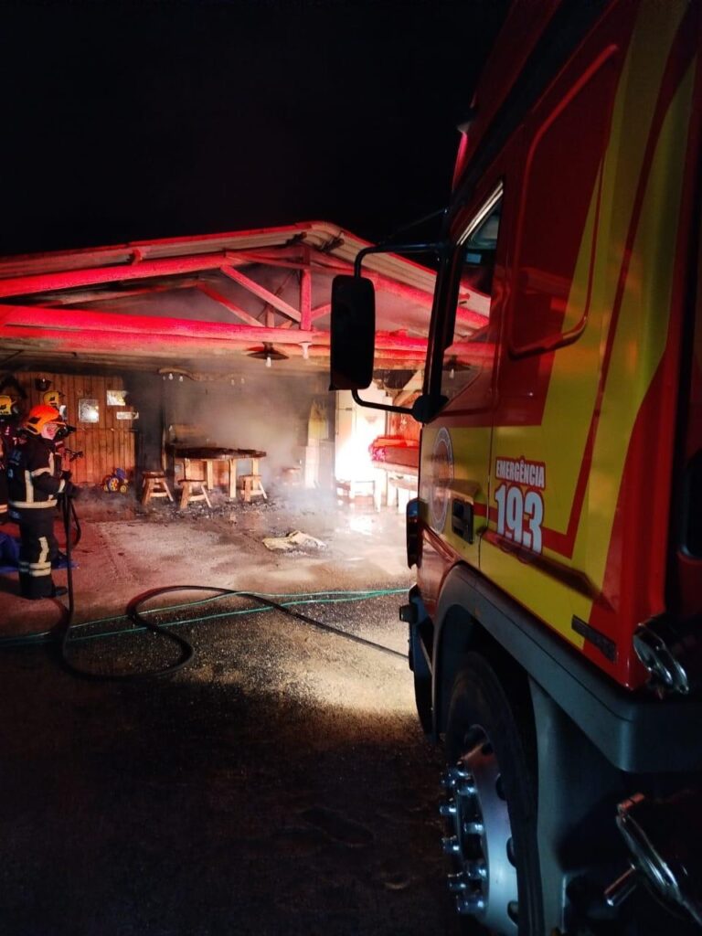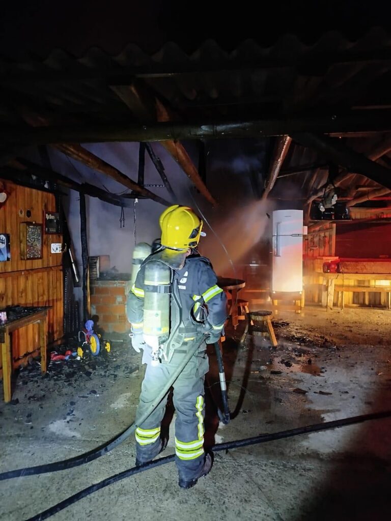 Um incêndio destruiu uma garagem com área gourmet de aproximadamente 42m² na madrugada desta sexta-feira (5), por volta das 3h30, na estrada geral Pico do Meio, em Meleiro. Apesar da intensidade das chamas, não houve registro de vítimas.