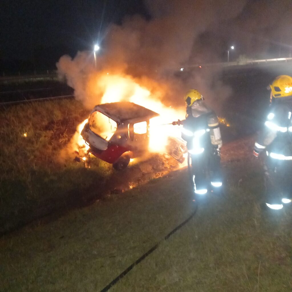 Um incêndio destruiu completamente um veículo Fiat Mobi na tarde desta quarta-feira (25), por volta das 18h, após um acidente de trânsito ocorrido na BR-101, no bairro Poço Oito, em Içara.