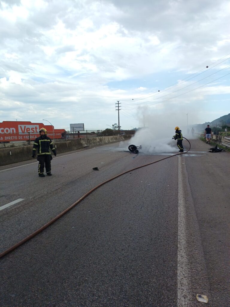 Na tarde deste sábado (4), um acidente envolvendo uma motocicleta seguido de incêndio mobilizou o Corpo de Bombeiros Militar de Tubarão. A ocorrência foi registrada por volta das 14h40, na rodovia BR-101, no bairro São Cristóvão, sentido sul, logo após o túnel.