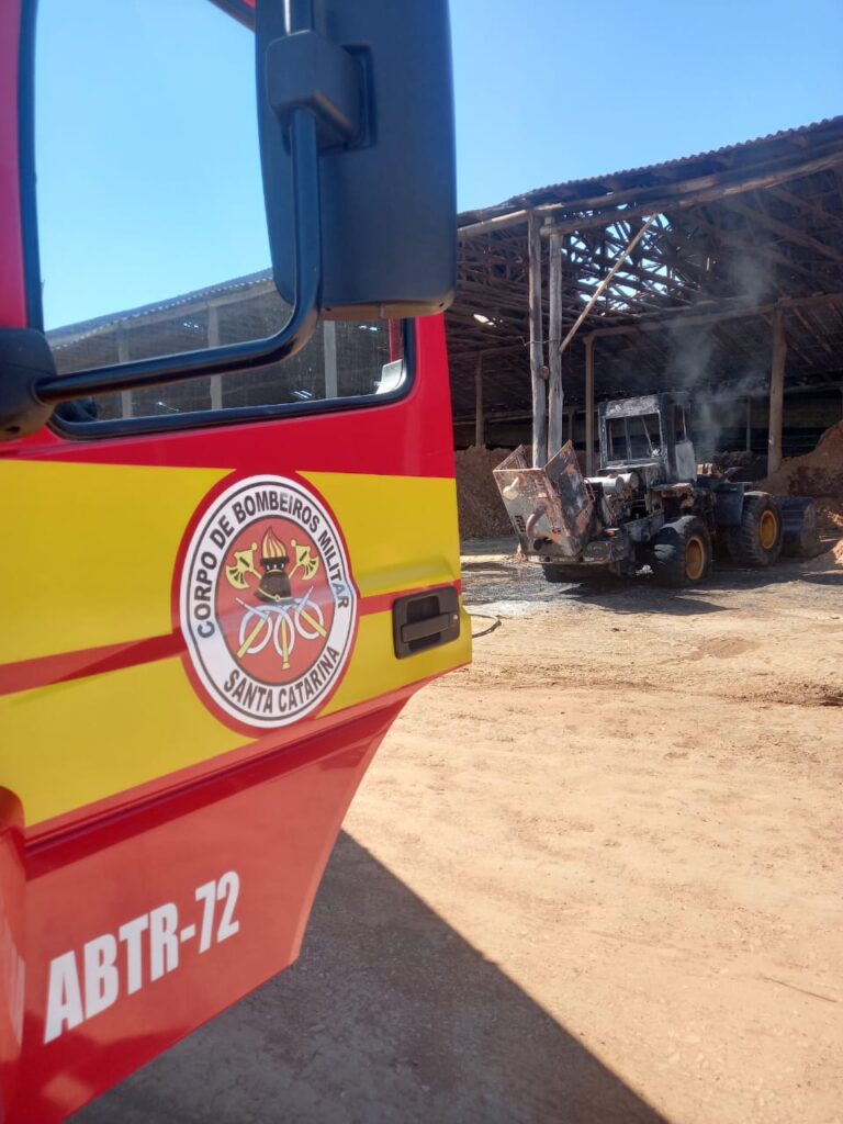 No local, os bombeiros confirmaram a ocorrência e encontraram o veículo, uma pá carregadeira, parcialmente retirado do pavilhão de 9.700 m² por funcionários e terceiros.