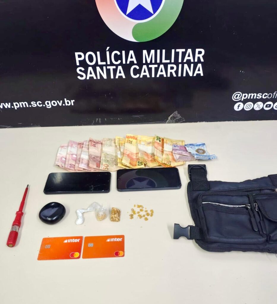 Na abordagem, os policiais encontraram cerca de 11,2 gramas de crack, a maior parte já fracionada para venda, 1 grama de cocaína e R$ 228 em dinheiro trocado em uma pochete. Com o outro suspeito, foram localizados dois cartões bancários. Dois celulares também foram apreendidos.