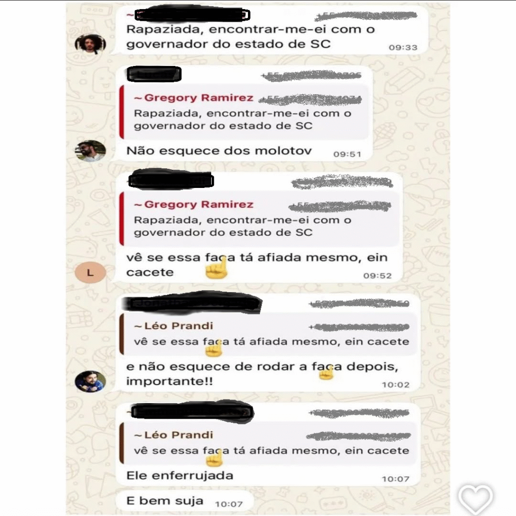 As mensagens, que vieram a público nos últimos dias, foram enviadas na última quinta-feira (11), quando um servidor da prefeitura de Benedito Novo, no Vale do Itajaí, avisou no grupo que encontraria o governador, que participava da inauguração de uma quadra poliesportiva no município. Em seguida, outros integrantes responderam com frases que sugeriam ataques, como menções a coquetéis molotov, faca afiada e até uso de arma enferrujada.