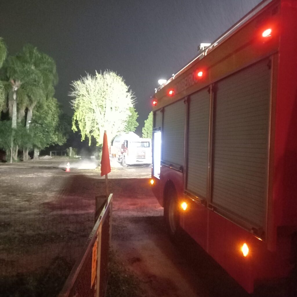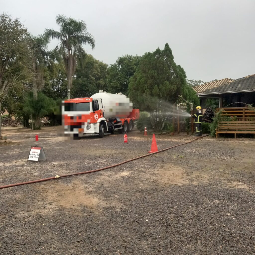 Segundo os bombeiros, o vazamento ocorreu em um caminhão-tanque que realizava o abastecimento de uma pizzaria. Ao chegar ao local, a guarnição confirmou a situação e realizou o isolamento da área, orientando o proprietário a interromper imediatamente as atividades, desligando fogões e a energia elétrica para evitar riscos de explosão.