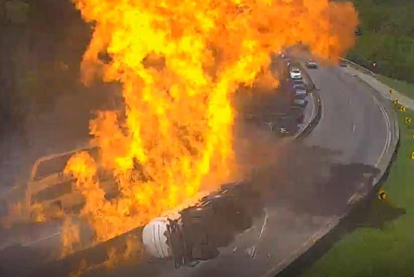 A câmera de monitoramento da concessionária que administra a rodovia flagrou a explosão e o momento em que o combustível escorre e as chamas rapidamente se alastram.