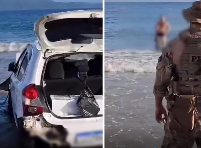 Um carro em fuga foi parar dentro da praia de Canasvieiras, em Florianópolis, na manhã dessa quinta-feira (6). Polícias Rodoviários Federais, que estavam se dirigindo um treinamento, flagraram o veículo em alta velocidade na SC-401.