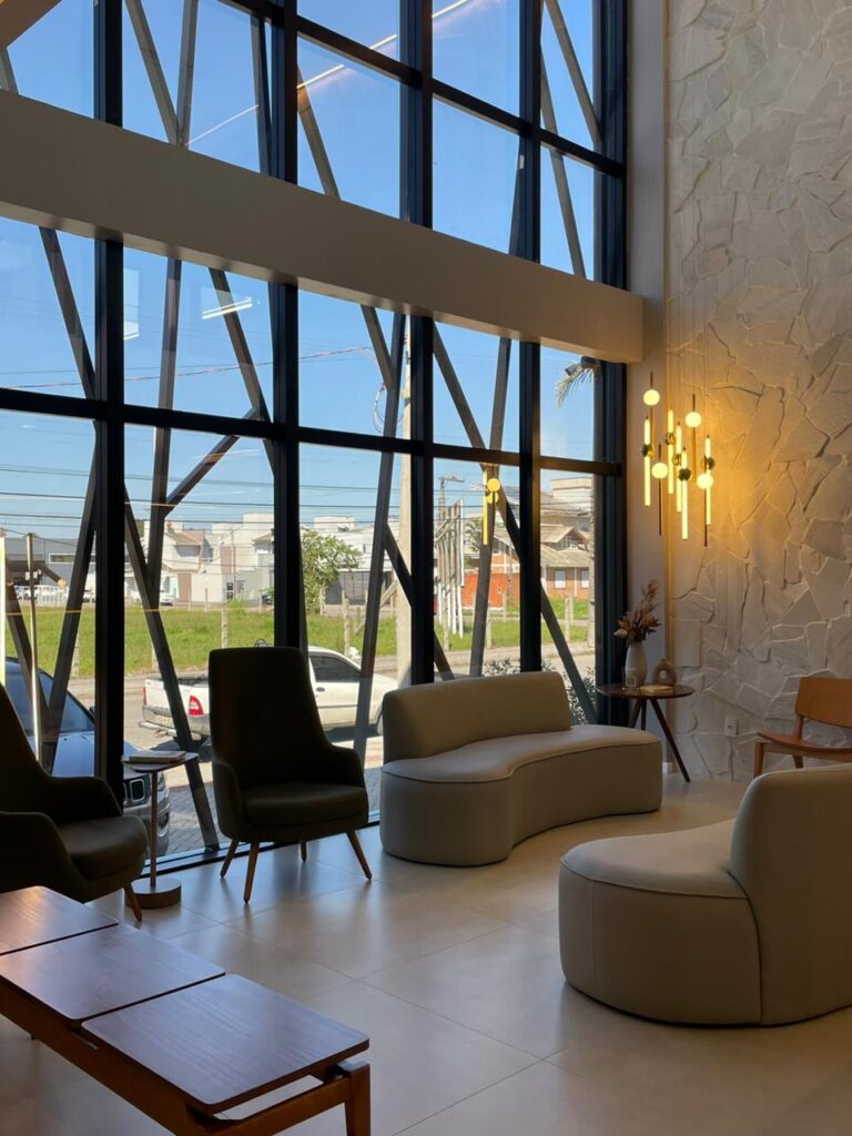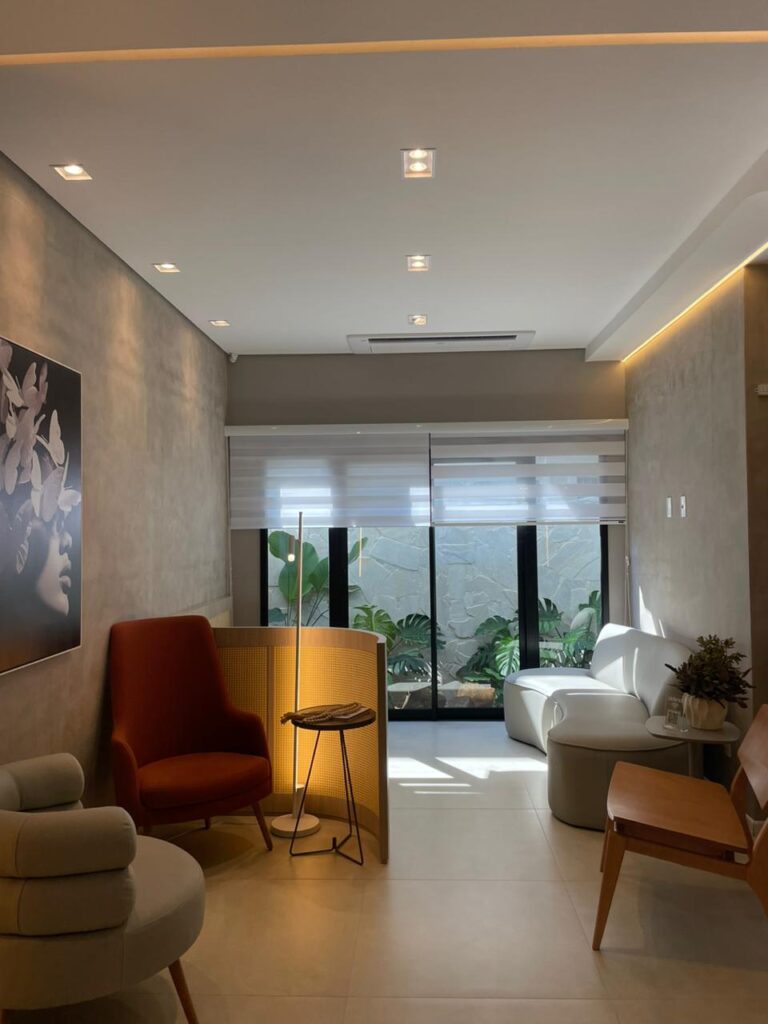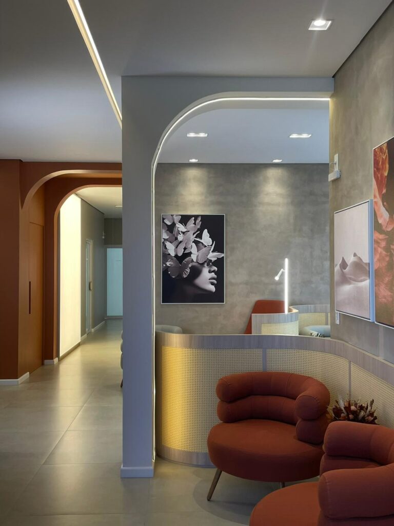 A iluminação, cuidadosamente pensada, evita excessos. Nem fria, nem dramática. Ela acolhe sem invadir. Cria conforto sem protagonismo. E isso, dentro de um espaço de saúde, muda tudo.