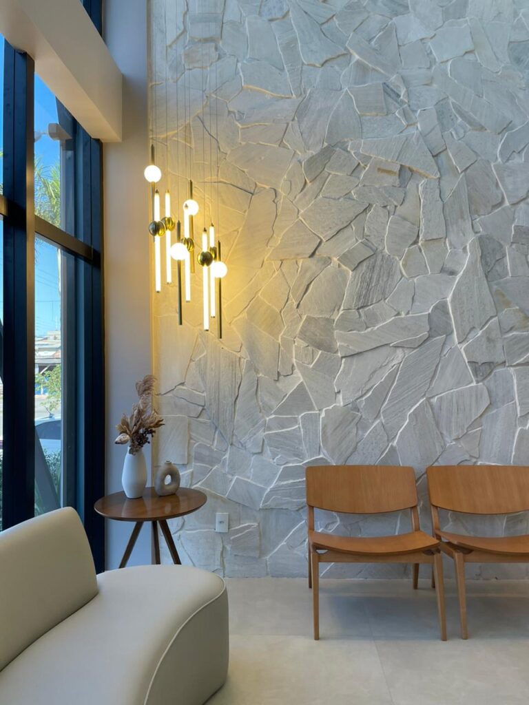Os materiais também comunicam. A pedra natural nas paredes traz uma sensação de permanência, de solidez, quase como se dissesse: “aqui você está segura”. Em contraste, as formas orgânicas do mobiliário suavizam o ambiente, afastando qualquer rigidez que remeta ao universo hospitalar.