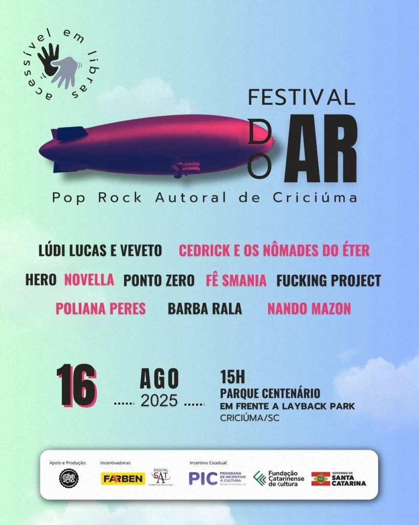 A primeira edição do “Festival do Ar,” reunirá um total de 10 bandas do rock e pop regional, do Sul de Santa Catarina, no dia 16 de agosto, a partir das 14h até por volta das 23h, no Parque Centenário, em frente à LayBack em Criciúma. A entrada é gratuita e a maratona musical é dedicada à música independente nas apresentações do repertório autoral de cada banda.