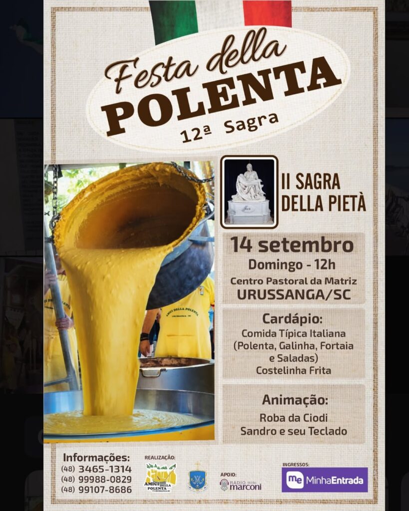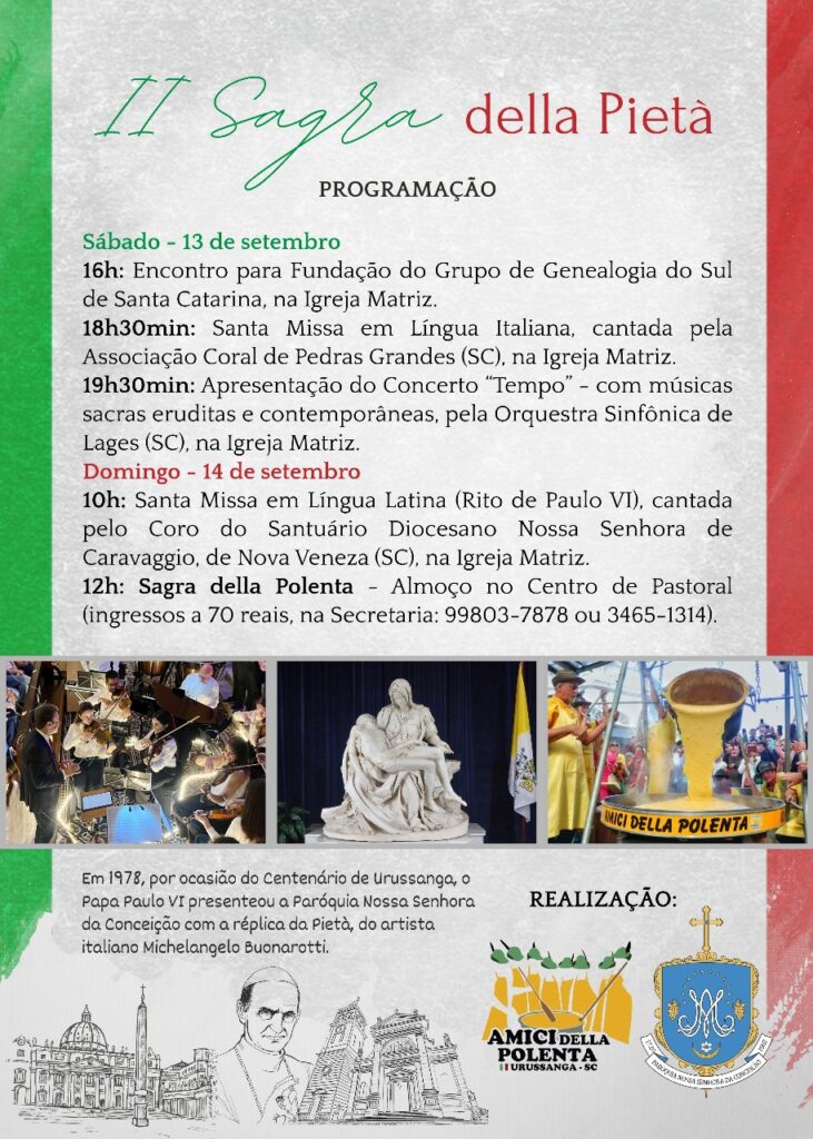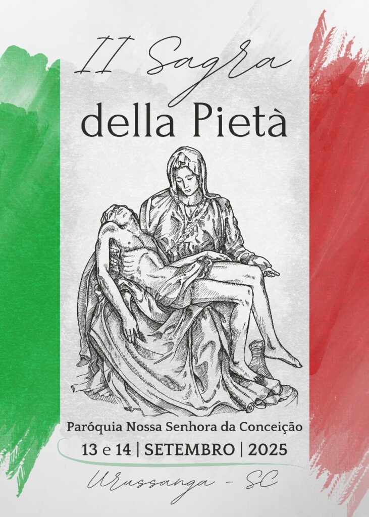 Urussanga terá um fim de semana marcado pela fé e pela tradição italiana com a realização da II Sagra della Pietà, nos dias 13 e 14 de setembro, organizada pela Paróquia Nossa Senhora da Conceição. O evento integra-se à 12ª Sagra della Polenta, promovida pelos Amici Della Polenta, reunindo música, gastronomia e religiosidade.